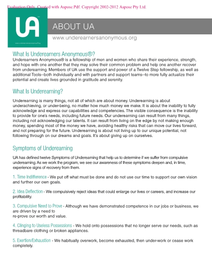 (Del folleto "Acerca de UA" disponible en https://www.underearnersanonymous.org/literature/)